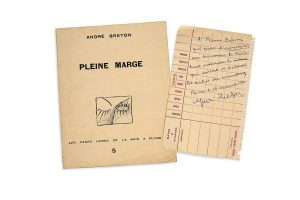 Billet autographe signé d'André Breton sur une page de carnet, encarté dans l'exemplaire: «A Pierre Béarn, qui pour l'ouverture rue Monsieur le Prince, tient suspendue la couronne que dorent et dédorent les arbres du Luxembourg. Paris, le 29 septembre 1960.