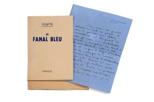 Colette (2 pp. in-8 à l'encre brune sur papier bleu, à entête du «9 rue de Beaujolais. Gut. 61-36») qui fut montée sur onglets, adressée à un «cher ami». (traces de pliures).