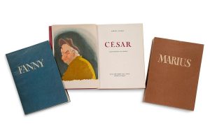Marius. Fanny. César. Monte-Carlo, Éditions du Livre, 1948 3 forts volumes in-8, 280 pp. (Marius), 228 pp. (Fanny), et 284 pp. (César), non rognés, couvertures rempliées titrées brune (Marius), bleue (Fanny), et framboise (César), couvertures à rabats de protection transparentes, le tout réuni dans un double étui de l'éditeur.