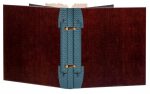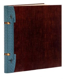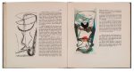 In-4, 40 lithographies dans le texte dont 18 en couleurs et 1 lithographie hors-texte à pleine page en couleurs. Plats de toile brun fauve bakélisée, charnières à partie centrale arrondie en relief et dos de box bleu pétrole estampé de motifs réguliers en forme de peigne à double tête, agrafes d'ébène serties d'ivoire, veau ocre jaune estampé de petits carreaux à l'endroit des nerfs; doublures de nubuck beige, gardes de papier anthracite; dos et couvertures conservés. Emboitage à dos de box caramel, doublé de nubuck beige. (Jean de Gonet, 2000).