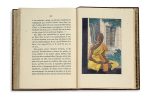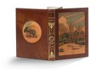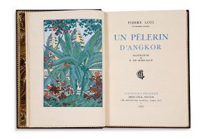 In-8, 247 pp., non rogné. Veau brun, plats creusés de décors ornés et peints sur veau blond creusé, une large fenêtre dans le plat supérieur contient une vue d'Angkor (signée ‘Théa 1933') et une circulaire sur le plat inférieur représente un éléphant marchant devant un temple antique, dos lisse orné et titré or, tête dorée, dentelle intérieure dorée, et gardes de papier marbré, chemise et étui de papier marbré assortis (T. Steibel).