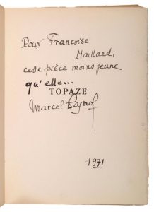 Édition originale enrichie d'un envoi autographe signé sur la page de faux titre à François Maillard «Pour Françoise Maillard, cette pièce moins jeune qu'elle... Marcel Pagnol. 1971.».