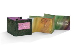 L'Adieu, livre conçu et peint par Anne WALKER In-16, 8 ff. montés en accordéon, couverture à larges rabats, gardes de papier de riz mauve, plats de brocart froissé vert et or avec pièce de titre en papier de riz mauve, étui-boîte recouvert de papier bronze au fond aquarellé, dos titré.