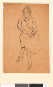 Dessin original d'Antonin Artaud au crayon sur papier, contrecollé sur une feuille de papier représentant Madame Toulouse assise.