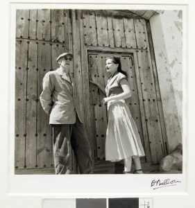 Tirage argentique signé au recto par Denise Bellon représentant, en Espagne en mai 1953, Henry Miller et son épouse devant une porte ancienne.