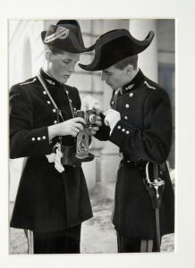 Tirage argentique d'époque portant au verso le tampon de Robert Doisneau et représentant deux polytechniciens penchés sur un appareil photo.