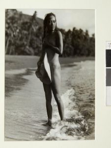 Tirage argentique d'époque représentant une tahitienne nue, seulement recouverte d'un chapeau.