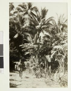 Tahitien portant des cocos et des feis (bananes rouges à cuir)
