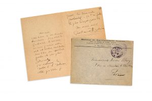 autographe signée du poète Guillaume Apollinaire adressée à un poète pour lequel il a donné un article dans le journal L'Intransigeant. «Votre livre a des beautés très élevées. J'en aime la fantaisie, la mesure comme j'aime votre art et votre culture [...] J'ai donné la note à l'Intran [...] je l'ai faite la plus longue possible [...]». Signed autograph letter addressed to a poet. S.l.n.d., 2 pages in-12 in brown ink on paper (traces of folds), envelope kept on the letterhead of the Italian Government Hospital (Paris). Autograph letter signed by the poet Guillaume Apollinaire addressed to a poet for whom he gave an article in the newspaper L'Intransigeant. "Your book has very high beauties. I love its fantasy, its measure as I love your art and your culture [...] I gave the note to the Intran [...] I made it as long as possible [...]".