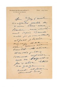 «Ce n'est pas très gentil de m'avoir laissé ainsi tomber aussi absolument depuis samedi matin et je vous attends, et je traine mon corps et une vie comme un boulet d'abime et ne sais plus comment respirer avec un hoquet qui valse dans une gorge [...]» Signed autograph letter addressed to Jacques PREVEL S.l. [Ivry-sur-Seine], November 4, 1946. 1 page and a half small in-8 in blue ink on letterhead paper of the Ivry nursing home, stamped envelope preserved. "It's not very nice to have let me down like this so absolutely since Saturday morning, and I've been waiting for you, and I'm dragging my body and a life like a millstone and don't know how to breathe with a hiccup waltzing down a throat [...]"