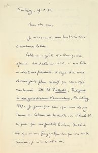 sera publié en 1961. «[...] je m'excuse de vous bombarder ainsi de nombreuses lettres [...] Il s'agit d'un recueil de vases peints plus récents que ceux déjà mentionnés [...] Je pense que ceci, que vous devriez trouver au Cabinet des Médailles, ou à la B. N. ne peut que vous faciliter les choses. Inutile de dire que si vous trouvez quelque chose qui semble vous convenir, je m'en remets à vous [...]». Signed autograph letter addressed to Jean-Marie LO DUCA Fontenay [-le-Comte], February 19, 1961. 2 pages in-8 in brown ink on paper (trace of folding). Letter relating to the book of Bataille Les Larmes d'Eros which will be published in 1961. "...] I apologize for bombarding you with so many letters ... This is a collection of painted vases more recent than those already mentioned ... I think that this, which you should find in the Medal Office, or at the B. N. can only make things easier for you. Needless to say, if you find something that seems to suit you, I leave it to you...".