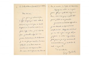 de faire un effort désespéré pour aboutir [...] Il m'arrive parfois de me trouver devant des corrections qui ont empiré mon texte [...] Ne m'abandonnez pas. Ecrivez-moi. Dites moi où vous en êtes [...] Je ferai mon possible pour faire taper pas trop tard, ces jours ci, ce qui existe en version définitive.» Signed autograph letter addressed to Jean-Marie LO DUCA Les Sables-d'Olonne, s.d. [1961]. 3 pages and a half in brown ink on paper. Letter addressed to Lo Duca about the Tears of Eros. "I have made and continue to make a desperate effort to succeed [...] Sometimes I find myself faced with corrections that have made my text worse [...] Do not abandon me. Do not abandon me. Write to me. Tell me where you are [...] I'll do my best to get the final version typed not too late these days."
