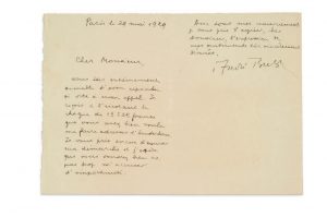 francs que vous avez bien voulu me faire adresser d'Amsterdam. Je vous prie encore d'excuser ma démarche et j'espère que vous voudrez bien ne pas trop m'accuser d'importunité [...]». Autograph letter signed Paris, May 29, 1929. 1 page ½ bi-sheet in-12 in ink on paper. Breton thanks his correspondent for having answered so quickly to his call; "[...] I receive at once the check of 13525 francs that you have kindly sent me from Amsterdam. I apologize again for this and I hope that you will not accuse me too much of importunity [...]".