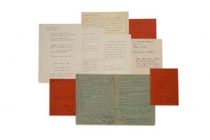 textes critiques pour l... double but: aller à Paulhan et mon livre sur lui extraire tout ce qui peut déjà insinuer mes vues physiologiques Le livre noir commence: Rêves. inf. Breton» - «Conclusions Comment conclure sans introduire des éléments nouveaux: «Une intuition seconde sur les lettres qui nous rende un peu raison de cette loi qui compose dans leur emploi la rhétorique - et la terreur, l'art de diviser, l'art d'unir. Cette intuition descriptive, je ne puis que la suggérer, et conseiller qu'on la vérifie sur le passage d'une correspondance privée à une oeuvre à publier. J'ai essayé avec Keats». Il cite Shakespeare «la capacité négative, c'est à dire le pouvoir qu'a un homme d'exister sur des incertitudes, des mystères, des doutes et sans atteinte «irritable». Sans atteinte eveillable après un fait ou une raison». Réflexion sur le choix de vocabulaire dans l'intime ou dans le public. Il s'appuie sur les travaux et réflexions de Paul ELUARD et de KEATS. - «Où la Terreur avance d'un pas. Réflexion sur la Terreur. «Elle ne nous enseigne pas à nous libérer». Il évoque la liberté de parole, qu'il relie à la liberté. - «Si j'ai mon joli temps perdu - Jaloux, venez donc - Vous les avez, ces vers d'album. - Rosette, pour un peu d'absence votre coeur vous avez changé Et moi, voyant cette inconstance Le mien autre part j'ai rangé» - Ensemble de pensées sans lien les unes aux autres, mélange de réflexions personnelles et peut être de fait établi (il évoque un incident avec Ernst): «Ce soir voir lavater... Incident Max Ernst qui m'oblige à sortir». Set of nine handwritten leaves S.d., various sizes. Probably working notes, sketches of texts and poems. - The Age of Rose in the Distance Creation of a style, evocation of his work: "Gathering of critical texts for the... double goal: to go to Paulhan and my book on him to extract everything that can already insinuate my physiological views The black book begins: Rêves. inf. Breton" - "Conclusions How to conclude without introducing new elements: "A second intuition on the letters which makes us a little reason for this law which composes in their use the rhetoric - and the terror, the art of dividing, the art of uniting. This descriptive intuition, I can only suggest it, and advise that it should be verified on the passage from private correspondence to a work to be published. I tried it with Keats". He quotes Shakespeare "the negative capacity, i.e. the power that a man has to exist over uncertainties, mysteries, doubts and without "irritable" attack. Without any awakenable attack after a fact or a reason". Reflection on the choice of vocabulary in the intimate or in the public. It is based on the work and reflections of Paul ELUARD and KEATS. - "Where Terror advances by one step. Reflection on Terror. "It does not teach us to free ourselves". It evokes freedom of speech, which it links to freedom. - "If I've got my nice time - Jealous, come on - You've got these scrapbooks. - Rosette, for a bit of absence your heart has changed And me, seeing this inconstancy Mine somewhere else I've put away" - A collection of unrelated thoughts, a mixture of personal reflections and perhaps, in fact, established (it evokes an incident with Ernst): "Tonight to see lavater... Incident Max Ernst that forces me to go out".