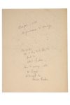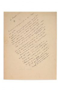 la bonté à Picasso. Il est cruel. Il se déteste lui-même. Il déteste l'art, ses propres tableaux. Le secret de sa diversité, de sa hauteur, c'est qu'il cherche chaque fois à se détruire, à se dépasser, à atteindre ce qui ne se peut atteindre. Toile / Voile de secret profond, de sa... mauvaise humeur. En somme il voudrait être un saint.... pas...... espagnol. Et il enrage de peindre». On Picasso, autograph manuscript S.d., 1 page in-8 in ink on paper. Nice text on the painter. "Didn't Picasso once speak out against us in Spain with injustice? It doesn't matter. You mustn't ask Picasso for kindness. He is cruel. He hates himself. He hates art, his own paintings. The secret of his diversity, of his height, is that each time he tries to destroy himself, to surpass himself, to reach what cannot be reached. Canvas / Veil of deep secret, of his own... bad mood. In short, he would like to be a saint... not... Spanish. And he is mad to paint".