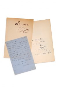 Aujourd'hui Demain l'ami Max». L'on joint une page sur laquelle Léonor Fini a calligraphié son nom et dessiné une tête de chat. L'on joint également une lettre autographe signée de Dorothea TANNING, dernière femme de Max Ernst (1 page in-8 à l'encre sur papier). Autograph poem signed Paris, June 5, 1950, 1 page in-4 in ink on paper. On the back of a page reproducing 3 photos of Max Ernst. Dedication in the form of a poem to Léonor FINI: "To Leonor Fini Sirène Si Reine ! Yesterday Today Today Tomorrow Friend Max". We enclose a page on which Leonor Fini has calligraphed his name and drawn a cat's head. Also attached is an autograph letter signed by Dorothea TANNING, Max Ernst's last wife (1 page in-8 in ink on paper).