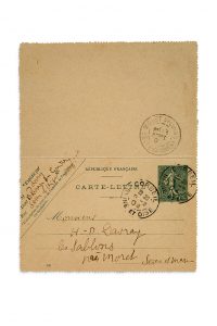 pour lui annoncer que Claude Terrasse s'était renseigné pour savoir s'il était possible d'obtenir un permis demi-tarif: «il va sans dire que le grand permis serait mieux [...] pour le Grand-Lemps (Isère)». Jarry demande que Devray lui envoie sa réponse en Seine-et-Oise et lui fournisse une autre adressée à Paris. Claude Terrasse, compositeur français d'opérettes, a écrit la musique de la pièce d'Alfred Jarry, Ubu roi. Signed autograph letter card addressed to H. D. DEVRAY S.l., [September 13, 1904], 1 page in-12 in ink, address handwritten on the back and resigned with his name (burnished paper). Letter addressed to translator H. D. Devray to inform him that Claude Terrasse had inquired whether it was possible to obtain a half-price permit: "it goes without saying that the big permit would be better [...] for the Grand-Lemps (Isère)". Jarry asked Devray to send him his reply in Seine-et-Oise and to provide him with another one addressed to Paris. Claude Terrasse, a French composer of operettas, wrote the music for Alfred Jarry's play, Ubu roi.
