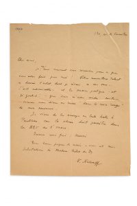 Pouchkine que ce dernier a fait pour une publication dans la NRF. «[...] C'est admirable - et le service poétique - et si gentil ! - que vous m'avez rendu restera - comme nous disons en russe «dans le coin rouge» de mon souvenir. [...] Je viens de les envoyer en toute hâte à Paulhan, car la chose doit paraître dans la NRV [NRF] du 1er mars [...]». Signed autograph letter addressed to Robert MÉLOT DU DY Paris, [1937], 1 page in-4 in brown ink on burnished paper. Letter of thanks addressed to Robert Mélot du Dy concerning a translation of verses by Pushkin that the latter made for publication in the NRF. "[...] It's admirable - and the poetic service - and so kind! - that you have rendered me will remain - as we say in Russian - "in the red corner" of my memory. I have just sent them in a hurry to Paulhan, because it is to appear in the NRV [NRF] on March 1.