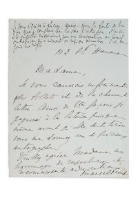 gagnerai à la loterie puisque même avant qu'elle soit tirée vous me donnez un si précieux autographe [...]». Note autographe de Marcel Proust en tête de lettre relative à Lucien Daudet, écrivain ami proche de Proust et fils d'Alphonse Daudet. Signed autograph letter addressed to Madame Alphonse DAUDET Paris, n.d., 1 page in-8 in ink on blue paper. "[...] I thank you very much for the notes and the charming letter. So anyway I will win the lottery since even before it is drawn you give me such a precious autograph [...]". Marcel Proust's autograph note at the head of the letter relating to Lucien Daudet, writer, close friend of Proust and son of Alphonse Daudet.