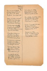 érotique. «[...] Sortira-t-il, Vénus, vainqueur ? / La selle de dame as de coeur / Entre vos cuisses bien caché / Je suis heureux d'être témoin [...]». Drum, autograph poem S.d., 1 page in-4 in brown ink on yellowed paper (tear without affectation at top right corner). Poem of 11 quatrains in ink titled "Tambour" by Raymond Radiguet, of erotic inspiration. "[...] Will he come out, Venus, the winner? / Lady's saddle has a heart / Between your thighs well hidden / I am happy to be a witness [...]".