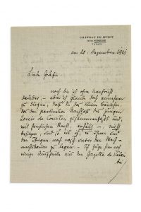 en allemand. Lettre et carte autographes signées en allemand relatives à Louis de Courten, poète du Valais à la Gazette du Valais, et aux bons voeux adressés à la comtesse Mariette von Courten. Signed autograph letter and card addressed to Marietta von COURTEN Munchen, 31 December 1918 and Château de Muzot sur Sierre (Valais), 20 December 1921, 2 pages in-12 in ink on paper, envelope preserved, in German. Autograph letter and card signed in German relating to Louis de Courten, poet of the Valais to the Gazette du Valais, and to the good wishes addressed to Countess Mariette von Courten.