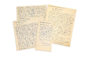 Gaspart, français né en Argentine (1900-1993), se lie d'amitié avec Pierre-Albert Birot, André Derain, Jean Follain, Marie Laurencin, André Salmon et Torres-Garcia. C'est durant ses années de captivité, durant la guerre, qu'il révèle tout son talent. Torres- Garcia fait part de toute sa détresse et sollicite le soutien de son ami. - 8 novembre [19]31, 2 pp. in-8. Magnifiques lettres sur la volonté de créer, la douleur d'être artiste. «Je vais tous les jours aux galeries, et c'est pour se décourager. Evidemment les choses vont de pire en pire. Mon impression est qu'il ne faut attendre rien du côté des marchands... Je dois lutter encore avec la peinture... En ce moment, justement, je ne dois arrêter à aucun prix ma peinture. Je sais que c'est le moment de réaliser mes meilleures choses. Plus je fais, plus je vois de choses à faire. Et pour cette raison, malgré les difficultés, je ne me suis pas arrêté, et j'ai fait encore des choses très bonnes... J'ai foi. Cela veut dire que je ne doute pas que, à la fin, la bataille sera gagnée pour l'esprit...» Demande quand Gaspart viendra le voir avec Follain, etc.; - 24 fév. 1932, 1 p. in-4. Le prie de l'aider pour «sortir d'une situation vraiment affreuse». Il va avoir trois expositions, notamment chez Jeanne Bucher avec Arp et Ernst, et «il me faudra vendre !!» Aussi, il demande à son ami pour qu'ils viennent aux vernissages avec des connaissances: il faut «du public, pour encourager les marchands... Cherchez (comme autres fois) parmi vos relations, des personnes susceptibles d'aimer et d'acheter quelque chose !»; - S.d. [1932], 1 p. in-12. Convie son ami au vernissage de son exposition à la Galerie Percier. Set of three signed autograph letters addressed to the painter Alfred GASPART S.l., 1931-1932, 4 pp. in ink on paper, various sizes, in French (some stains). In Montparnasse, the painter Alfred Gaspart, a Frenchman born in Argentina (1900-1993), became friends with Pierre-Albert Birot, André Derain, Jean Follain, Marie Laurencin, André Salmon and Torres-Garcia. It is during his years of captivity, during the war, that he reveals all his talent. Torres-Garcia expresses all his distress and solicits the support of his friend. - 8 November [19]31, 2 pp. in-8. Wonderful letters on the will to create, the pain of being an artist. "I go to the galleries every day, and it is to be discouraged. Obviously things are getting worse and worse. My impression is that you can't expect anything from the dealers... I still have to struggle with painting... At this moment, precisely, I must not stop my painting at any cost. I know that this is the time to do my best things. The more I do, the more things I see to do. And for this reason, in spite of the difficulties, I did not stop, and I still did some very good things... I have faith. That means I have no doubt that in the end the battle will be won for the spirit..." Ask when Gaspart will come to see him with Follain, etc.; - Feb. 24, 1932, 1 p. in-4. Priests him to help him to "get out of a really awful situation". He is going to have three exhibitions, notably at Jeanne Bucher's with Arp and Ernst, and "I'll have to sell!!". So he asks his friend to bring people he knows to the openings: "We need the public, to encourage the dealers... Look for (as other times) among your acquaintances, people likely to like and buy something"; - S.d. S.d. [1932], 1 p. in-12. Invites his friend to the opening of his exhibition at the Galerie Percier.