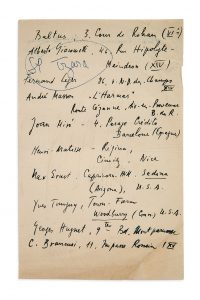 «Baltus, 3 cour de Rohan (VIe), Alberto Giacometti, 46 rue Hypolyte Maindron (XIV), Fernand Léger 86, r. N.D des champs (XIV), André Masson «L'Harmas» route Cézanne, Aix-en-Provence, Joan Miró - 4, Pasaje Crédito Barcelone (Espagne), Henri Matisse - Regina, Cimiez, Nice, Max Ernst Capricorn-Hill. Sedona (Arizona), U.S.A., Yves Tanguy, Town-farm Woodburry (Conn.) U.S.A., Georges Hugnet, 9 ter Bd. Montparnasse, C. Brancusi, 11, impasse Ronsin / XV Henri Laurens, 11 bis Villa Brune XIV». Cette note destinée au service de presse (marque SP au stylo bleu sur la page) est très probablement liée à la publication du livre Tristan Tzara. Poètes d'aujourd'hui (Seghers, 1952). Autograph coin S.l.n.d. [circa 1950], 1 page ¼ in-8 in black ink on paper. List written by Tristan Tzara listing several artists' addresses (Balthus, Giacometti, Léger, Miró, Matisse, Brancusi...). "Baltus, 3 cour de Rohan (VI), Alberto Giacometti, 46 rue Hypolyte Maindron (XIV), Fernand Léger 86, r. N.D des champs (XIV), André Masson "L'Harmas" route Cézanne, Aix-en-Provence, Joan Miró - 4, Pasaje Crédito Barcelona (Spain), Henri Matisse - Regina, Cimiez, Nice, Max Ernst Capricorn-Hill. Sedona (Arizona), U.S.A., Yves Tanguy, Town-farm Woodburry (Conn.) U.S.A., Georges Hugnet, 9 ter Bd. Montparnasse, C. Brancusi, 11, impasse Ronsin / XV Henri Laurens, 11 bis Villa Brune XIV". This note to the press service (SP mark with blue pen on the page) is most probably related to the publication of the book Tristan Tzara. Poets of Today (Seghers, 1952).