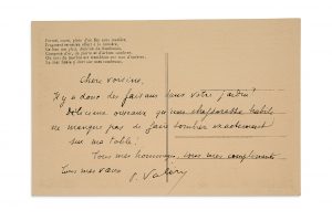 VALERY Paul (1871-1945) Carte postale autographe signée adressée à Jeanne LUCIEN-MUHLFELD [Sète], s.d., encre brune. Carte postale spirituelle signée par Paul Valéry adressée à la célèbre salonnière Jeanne Muhlfeld. «Chère voisine. Il y...