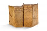 édition de Prefaces generales, de Sommaires au commencement de chacun des Traitez, & d'Annotations en marge, qui monstrent l'artifice & la suite des discours de l'auteur, Avec un Indice des choses memorables mentionnees esdites oeuvres. Paris, chez Jean Du-Carroy, 1587 2 forts volumes in-8 (le tome II plus grand). Plein vélin rigide à petits rabats, dos long titré et avec tomaison à l'encre (reliure d'époque).