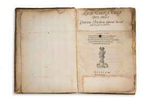 DD-[DD6], EE-[EE6], [FF-FF6], GG-[GG6], HH-[HH6] - 1 ff. bl., II-[II6], KK-[KK6], LL-LL3], en latin. Peau de truie estampée sur ais de bois biseautés, multiples filets et roulettes estampés à froid avec petits médaillons ornés de portraits, médaillon central serti de roulettes, cachet aux armes non identifiées et fleurons à froid, dos à nerfs avec pièce de titre estampée à froid (reliure d'époque). épître dédicatoire. Vie de Sénèque. Vignettes et lettrines ornées. À noter que le feuillet de titre a été découpé et restauré visiblement au XVIIIe siècle avec le titre manuscrit rapporté ainsi que la date de 1529. Annotations marginales d'époque, manuscrites à l'encre (pp. 273, 279) et en latin. Bel exemplaire dans une riche reliure d'époque en peau de truie. (Premier cahier détaché; mors du plat supérieur partiellement cassé, épidermures sur le plat inférieur). Lucii Annæi Senecæ Opera Omnia. Quorum Elenchum sequens huius paginæ facies exhibet. Basileae, [1529] Large volume in-4 (322 x 230 mm), complete of 701 pp. - 1 ff. bl., AA-[AA6], BB-[BB6], CC-[CC6], DD-[DD6], EE-[EE6], [FF-FF6], GG-[GG6], HH-[HH6] - 1 ff. bl., II-[II6], KK-[KK6], LL-LL3], in Latin. Sowhide stamped on bevelled wooden ais, multiple fillets and cold-stamped castors with small portrait medallions, central medallion set with castors, stamp with unidentified arms and cold-stamped fleurons, spine with ribs and cold-stamped title coin (period binding). Dedication epistle. Life of Seneca. Ornate vignettes and lettering. Note that the title page was cut out and visibly restored in the 18th century with the manuscript title brought back and the date 1529. Marginal period annotations, manuscripts in ink (pp. 273, 279) and Latin. A fine copy in a rich period sowskin binding (first notebook detached; top cover jaws partially broken, skin on the lower cover).