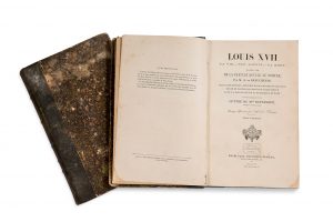 d'or, gardes de papier marbré. Quatrième édition de ce grand classique de l'histoire de la Révolution française précédée d'une lettre de Mgr. Dupanloup, évêque d'Orléans, et contenant des planches gravées et fac-similés d'autographes hors texte. Beauchesne était qualifié par l'historien Philippe Delorme comme «l'un des plus fameux spécialistes de la question Louis XVII». PROVENANCE Librairie Caillière, Paris (étiquettes sur pages de titre). (Manquent les portraits gravés de Louis XVII (premier vol.) et de Marie-Antoinette (second vol.). (Reliure en fort état d'usage, abîmée; garde et 2 ff. arrachés en début du second volume, rousseurs). Louis XVII. His life - His agony - His death; Captivity of the royal family in the Temple. Paris, Plon, 1866 2 volumes in-8, [XXIV pp.], 589 and 532 pp. Bound in half leather, spine with raised bands, title and tomaison in gold letters, marbled endpapers. Fourth edition of this great classic of the history of the French Revolution preceded by a letter from Mgr. Dupanloup, bishop of Orleans, and containing engraved plates and facsimiles of autographs out of text. Beauchesne was described by the historian Philippe Delorme as "one of the most famous specialists on the Louis XVII question". PROVENANCE Librairie Caillière, Paris (labels on title pages). (The engraved portraits of Louis XVII (first vol.) and Marie-Antoinette (second vol.) are missing. (Binding in very good condition, damaged; endpaper and 2 ff. torn off at the beginning of the second volume, freckles).