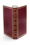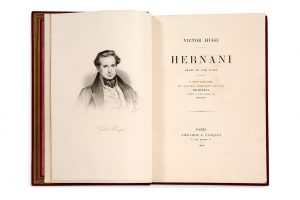 intérieur, filets dorés sur chasses et tranchefiles, tranches dorées sur témoins, couverture, étui (Canape, 1916). Tirage à 500 exemplaires, celui-ci un des 30 de tête sur Japon ou vélin du Marais, avec 3 états des gravures, dont l'eau-forte pure. Exemplaire n°1 sur vélin, paraphé par l'éditeur. Un portrait-frontispice de l'auteur d'après Eugène Devéria en doubleétat et 15 compositions de Michelena, dont 5 en-têtes, 5 hors-textes et 5 culs-de-lampe, le tout gravé à l'eau-forte par Léon Boisson. PROVENANCE Bibliothèques Robert Beauvillain (ex-libris) et André Sciama (ex-libris). Hernani. Drama in five acts. Paris, Conquet, 1890. In-8, 6 ff. of which cover and false title, 223 pp., 5 ff... Red morocco, multiple bold and thin fillets in the frame, spine titled and decorated in the same style, inner frame, gilt fillets on hunting and headbands, gilt edges on witnesses, cover, case (Canape, 1916). Edition of 500 copies, this one one of the top 30 on Japon or Marais vellum, with 3 states of engravings, including pure etching. Copy n°1 on vellum, initialled by the publisher. A portrait-frontispiece of the author after Eugène Devéria in double state and 15 compositions by Michelena, including 5 headings, 5 off-texts and 5 culs-de-lampe, all engraved in etching by Léon Boisson. PROVENANCE Libraries Robert Beauvillain (ex-libris) and André Sciama (ex-libris).