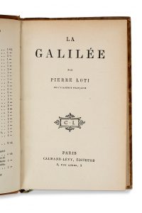 LOTI Pierre (1850-1923) La Galilée. Paris, Calmann-Levy éditeur, s.d. In-12, [5 ff.]-248 pp. Demi-basane blond, dos lisse à faux-nerfs et titré or, gardes de papier marbré, signet vert conservé (reliure d'époque). Rédigés entre 1895 et 1907:...