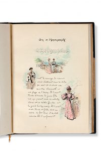 de la nouvelle sont publiées en fac-similé de l'écriture. Les illustrations sont entièrement aquarellées par Henriot. L'exemplaire est accompagné d'une suite à part de tous les dessins sur papier de Chine. Tirage à 100 exemplaires sur Japon, celui-ci le n°46. Très belle édition aquarellée dans une jolie reliure moderne. (Plats légèrement frottés et coins émoussés). Carelessness. Paris, Aux dépens d'un ami des Livres [Albert Bélinac], 1899. Large in-8, midnight blue half maroon with corners, smooth spine decorated with tulips, gilt spine head (Durvand binding). Edition of which the 30 pages of the short story are published in facsimile. The illustrations are entirely watercoloured by Henriot. The copy is accompanied by a separate set of all drawings on China paper. Edition at 100 copies on Japan, this one the n°46. Very nice watercolor edition in a nice modern binding. (Slightly rubbed plates and blunt corners).