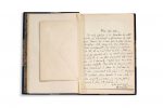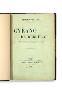 onglets, 225 pp, 1 ff. bl., couv. et dos conservés, 2 ff. bl. Demi-maroquin bleu à coins, dos à nerfs titré or, gardes de papier marbré, tête dorée, signet en tissu tricolore conservé. édition originale du chef-d'oeuvre théâtral de Rostand, Cyrano de Bergerac. Un des 50 exemplaires de tête sur japon, seul grand papier. Cette édition comporte un envoi autographe signé adressé à l'auteur dramatique et académicien Henri LAVEDAN (1859-1940), accompagné d'une lettre autographe signée (1 page in-12 à l'encre brune) adressée au même avec son enveloppe conservée, montées sur onglets. «[...] J'ai voulu répondre à la franchise de votre amitié me demandant la permission de voter pour Masson au 1er tour par la plus absolue discrétion. [...]». Contrecollée sur le feuillet suivant la couverture, une invitation découpée sur papier bleu pour la Réception d'Edmond Rostand qui eut lieu le 4 juin 1903 à l'Académie Française. écrite entre 1896 et 1897, cette comédie dramatique en cinq actes, écrite presque entièrement en alexandrins, est créée le 28 décembre 1897 au Théâtre de la Porte Saint-Martin. Elle devient le plus grand succès théâtral depuis Hernani. Un succès sans précédent: quarante rappels ! La pièce sera jouée 400 fois de décembre 1897 à mars 1899. Rostand est élu à l'Académie française en 1901: il y est reçu à trente-trois ans, soit le plus jeune académicien d'alors. PROVENANCE Librairie Pierre Chrétien (signet tamponné); Librairie Georges Andrieux (signet); Bibliothèque de Gérard de Berny (ex-libris), ancien sénateur de la IIIe République; Henri Lavedan. (Coins légèrement émoussés, plats frottés, dos usagé). Cyrano de Bergerac. Heroic comedy in five acts in verse. Paris, Charpentier et Fasquelle, 1898, accompanied by an autograph letter signed by the author In-8, 2 bl. ff., green cover, L.A.S. and envelope mounted on tabs, 225 pp, 1 bl. ff., cover and spine preserved, 2 bl. ff. Blue half-marroquin with corners, spine with gold titled ribs, marbled paper endpapers, gold head, preserved bookmark in tricolor cloth. Original edition of Rostand's theatrical masterpiece, Cyrano de Bergerac. One of the 50 copies of head on japanese, only large paper. This edition includes a signed autograph mailing addressed to the playwright and academician Henri LAVEDAN (1859-1940), accompanied by a signed autograph letter (1 page in-12 in brown ink) addressed to the same with his preserved envelope, mounted on tabs. "[...] I wanted to respond to the frankness of your friendship asking for permission to vote for Masson in the 1st round by the most absolute discretion. [...]». Laminated on the page following the cover is an invitation cut out on blue paper for Edmond Rostand's Reception which took place on June 4, 1903, at the Académie Française. Written between 1896 and 1897, this dramatic comedy in five acts, written almost entirely in Alexandrian, premiered on December 28, 1897 at the Théâtre de la Porte Saint-Martin. It became the greatest theatrical success since Hernani. An unprecedented success: forty encores! The play will be performed 400 times from December 1897 to March 1899. Rostand was elected to the Académie française in 1901: he was admitted at the age of 33, the youngest member of the Académie at the time. PROVENANCE Librairie Pierre Chrétien (stamped bookmark); Librairie Georges Andrieux (bookmark); Bibliothèque de Gérard de Berny (ex-libris), former senator of the Third Republic; Henri Lavedan. (Slightly blunt corners, rubbed plates, used back).
