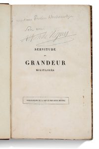 d'un envoi autographe signé à la mine de plomb sur la page de faux-titre: «A Madame Pauline Duchambge». Pauline Duchambge, grande amie de Vigny, mit en musique les poèmes de Marcelline Desbordes-Valmore. Exemplaire à toutes marges établi par Lortic. RéFéRENCE Clouzot 161. Carteret II-458 (Les quatre coins sont émoussés et légères tâches et rousseurs dans le volume). Military servitude and grandeur. Paris, Félix Bonnaire, Victor Magen. 1835. In-8, red maroquined half-chagrin of the period, combed paper plates, back with 5 nerves, gilded head. [Lortic]. Original edition enriched with an autograph signed in pencil on the page of the forgery: "A Madame Pauline Duchambge". Pauline Duchambge, great friend of Vigny, set to music the poems of Marcelline Desbordes-Valmore. Copy in all margins established by Lortic. REFERENCE Clouzot 161. Carteret II-458 (The four corners are blunt and slightly stained and freckled in the volume).