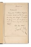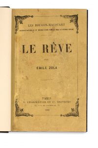 gardes de papier marbré, couverture jaune imprimée et dos conservés (couverture et dos salis et doublés). édition originale. Exemplaire enrichi d'une lettre autographe signée «émile Zola» (1 pp. in-16) montée sur onglets en tête du volume, adressée à une inconnue: «Auriez-vous l'obligeance de joindre demain matin à ce que vous devez nous envoyer, le paquet de frange d'or que ma femme a choisi et laissé chez vous sur une table ?». Bien complet du catalogue de l'éditeur. RéFéRENCE L. Carteret, Le Trésor du bibliophile romantique et moderne, II, pp. 486-487. (Nombreuses rousseurs, restauration dans la marge extérieure de la page 5 du catalogue de l'éditeur). The Dream. Paris, G. Charpentier et Cie, 1888. In-12, 3 ff. bl., cover, l.a.s., false title, title, 310 pp., 10 pp., cover and spine, 3 ff. bl. Blue half-marroquin from the Laurenchet workshops, spine ribbed, titled and ornamented, gilt head, marbled paper endpapers, yellow printed cover and spine preserved (cover and spine dirtied and lined). Original edition. Copy enriched with an autograph letter signed "Émile Zola" (1 pp. in-16) mounted on tabs at the head of the volume, addressed to a stranger: "Would you be so kind as to enclose tomorrow morning with what you are to send us, the packet of gold fringe that my wife has chosen and left at your home on a table". Very complete from the publisher's catalogue. REFERENCE L. Carteret, Le Trésor du bibliophile romantique et moderne, II, pp. 486-487 (Numerous freckles, restoration in the outer margin of page 5 of the publisher's catalogue).
