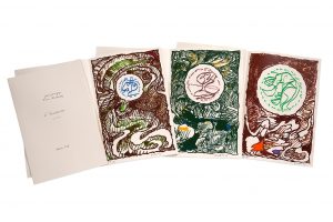 originale du manuscrit en fac-similé de L'Excédante, contenant trois poèmes d'Yves Bonnefoy (L'origine de l'écriture; La décision d'être peintre; L'Excédante) illustrés chacun d'une lithographie en couleur avec une eauforte centrale par Pierre Alechinsky. Un des 90 exemplaires sur Vélin d'Arches (n° 39) signés par l'auteur et l'artiste au colophon. Chaque planche est signée au crayon par l'artiste. Bel exemplaire. (Légères traces de salissures sur l'étui). The Excess. Paris, éditions F. B., 1982 In-folio (480 x 326 mm), 8 ff. on Arches wove paper, in sheets, in an original cloth-lined slipcase with a titled spine (Charron-Cotensin). Original edition of the facsimile manuscript of L'Excédante, containing three poems by Yves Bonnefoy (L'origine de l'écriture; La décision d'être peintre; L'Excédante) each illustrated with a colour lithograph with a central etching by Pierre Alechinsky. One of the 90 copies on Vélin d'Arches (n° 39) signed by the author and the artist on colophon. Each plate is signed in pencil by the artist. Nice copy. (Slight traces of dirt on the case).