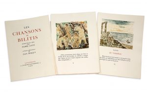 cuivres originaux en couleurs de Jean BERQUE. Tirage limité à 125 exemplaires numérotés, un des 95 sur vélin de Rives (n° 119). (Emboîtage en fort état d'usage; couverture piquée; légères rousseurs) The Songs of Bilitis. Paris, Lallemand, 1946. In-folio (386 x 290 mm), VIII, 188 pp., in sheets, printed in red and black. Filled cover, under blue cloth cover. Illustrated with original brass instruments in the colours of Jean BERQUE. Limited edition of 125 numbered copies, one of 95 on Rives vellum (n° 119). (Box in very good condition; quilted cover; light browning).