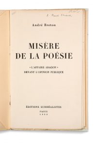 protestation écrit par André Breton contre l'inculpation d'Aragon pour son poème Front rouge paru dans la revue «Littérature de la Révolution Mondiale». Cette protestation fut appuyée par plus de 300 signataires. Exemplaire hors commerce sur Hollande van Gelder de ce libelle qui reproduit in fine le poème litigieux. Exemplaire HC appartenant à Paul éluard avec dédicace de Breton. Miseries of poetry, The Aragon Affair before public opinion. Paris, Éditions surréalistes, 1932. In-8, 32 pp. Paperback, stapled, flap cover. Original edition on publishing paper of this protest text written by André Breton against the indictment of Aragon for his poem Front rouge published in the magazine "Littérature de la Révolution Mondiale". This protest was supported by more than 300 signatories. Non-commercial copy on Hollande van Gelder of this libel which reproduces in fine the litigious poem. HC copy belonging to Paul Éluard with dedication by Breton.