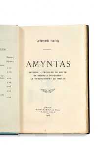 GIDE AndrE (1869-1951) Amyntas. Mopsus. Feuilles de route. De Biskra à Touggourt. Le Renoncement au voyage. Paris, Mercure de France, 1906 In-12, 3 ff. bl., 291 pp., couv. et dos, 3 ff. bl.. Maroquin bleu nuit, dos à nerf titré or, doublures de...