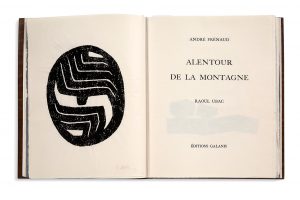 creux d'une déclinaison de tons bruns rappelant l'ordonnance des champs dans les reliefs de terrain, décor se poursuivant au dos lisse avec titre doré en long, doublure de peau de buffle brune, gardes de daim gris, couverture et dos, chemise et étui toilés assortis (Monique Mathieu). édition originale de ce recueil de 29 poèmes inédits d'André Frénaud entièrement montée sur onglets. 16 empreintes d'ardoise originales de Raoul Ubac dont le frontispice signé au crayon et 12 hors texte. Tirage limité à 90 exemplaires numérotés, signés par l'auteur et l'artiste. Un des 20 exemplaires sur Japon Misumi (n° 20), accompagnés d'une suite de 16 empreintes signées d'Ubac sur Japon Hodomura. Chaque planche de la suite est justifiée et signée au crayon par ubac. Exemplaire enrichi d'un long envoi autographe signé de Frénaud à Michel Wittock sur le faux-titre, d'une eau-forte originale (marquée ‘E.A.') signée d'Ubac montée en tête, et de deux pages au stylo bille bleu sur papier réglé contenant des poèmes autographes de Frénaud (La Faille, Accueil, On s'installe [le titre sera changé dans la version imprimée en Pour se réchauffer], et deux versions de Qui perdure), et un poème, Conjuration. L'Ancien temps (1 p. au stylo bille sur carton d'invitation du Centre Georges Pompidou). Très bel exemplaire, relié par monique mathieu, l'épouse du poète. RéFéRENCES Raoul Ubac n° 93; Reliures de Monique Mathieu 34 (ill.). Coron La Liberté du relieur, p. 71 (ill.); Musea Nostra p. 88 (ill.); Peyré pp. 206- 107, ill. 177; Lhermitte 259. (Petits accrocs au dos de la chemise et de l'étui). Around the mountain. Illustrations by Raoul Ubac. Paris, Féquet- Baudier for Galanis Editions, 1980. In-folio, in sheets, uncut. Black cowhide, plates composed of reliefs and hollows in a variation of brown tones reminiscent of the order of the fields in relief, decoration continuing on the smooth spine with a long gilt title, brown buffalo skin lining, grey suede guards, cover and spine, matching cloth shirt and case (Monique Mathieu). Original edition of this collection of 29 unpublished poems by André Frénaud, entirely mounted on tabs. 16 original slate prints by Raoul Ubac, including the frontispiece signed in pencil and 12 off-text. Limited edition of 90 numbered copies, signed by the author and the artist. One of the 20 copies on Japon Misumi (n° 20), accompanied by a set of 16 prints signed by Ubac on Japon Hodomura. Each plate of the suite is justified and signed in pencil by ubac. Copy enriched with a long autograph long consignment signed from Frénaud to Michel Wittock on the false title, an original etching (marked 'E.A.') signed by Ubac mounted on the head, and two pages in blue ballpoint pen on ruled paper containing autograph poems by Frénaud (La Faille, Accueil, On s'installe [the title will be changed in the printed version to Pour se réchauffer], and two versions of Qui perdure), and a poem, Conjuration. L'Ancien temps (1 p. in ballpoint pen on invitation card from the Centre Georges Pompidou). Very beautiful copy, bound by Monique Mathieu, the poet's wife. REFERENCES Raoul Ubac no. 93; Monique Mathieu bindings 34 (ill.). Coron La Liberté du reliur, p. 71 (ill.); Musea Nostra p. 88 (ill.); Peyré pp. 206- 107, ill. 177; Lhermitte 259. (Small snags on the back of the folder and case).