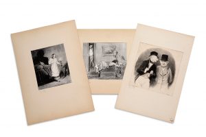 DAUMIER HonorE (1808-1879) Les Annonces (2) - les Baigneurs (10) - les Bas-Bleus (12) - Les Amis (3) - les Baigneuses (4) - les Beaux Jours de la vie (13 p.) Lithographies sur vélin blanc, une est coloriée. Rousseurs, taches, certaines un peu...