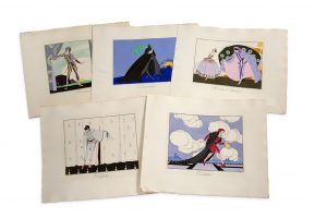 Journal des Dames et des Modes, 1914 In-folio oblong (382 x 515 mm), [6 ff.], 12 planches, en feuilles, couverture imprimée, chemise à rabats et emboitage de papier marbré de l'éditeur. Superbe album de 12 planches de Brunelleschi coloriées au pochoir et aquarellées, peignant différents personnages de la commedia dell'arte: Scaramouche, Tartaglia, Arlequin, Pantalon, Trivellino, Rosauro, Doctor Ballanzone, Brigghela, Mezzetin et Columbine, Coralline, Florindo et Giacometta. Tiré à 415 exemplaires. Un des 400 sur grand vélin d'Arches entièrement à la forme (n° 114). Bel exemplaire. (Couverture pliée, quelques piqûres; chemise en état d'usage et emboitage abîmé). The Masks and Characters of the Italian Comedy, explained by Gérard d'Houville, and interpreted by Brunelleschi, in twelve colourful prints. Paris, Aux bureaux du Journal des Dames et des Modes, 1914 In-folio oblong (382 x 515 mm), [6 ff.], 12 plates, in sheets, printed cover, folder with flaps and marbled paper slipcase from the publisher. Superb album of 12 stenciled and watercolored Brunelleschi plates, painting different characters of the commedia dell'arte: Scaramouche, Tartaglia, Harlequin, Pantalone, Trivellino, Rosauro, Doctor Ballanzone, Brigghela, Mezzetin and Columbine, Coralline, Florindo and Giacometta. Edition of 415 copies. One of the 400 on full form Arches wove paper (No. 114). Nice copy. (Folded cover, a few stitches; folder in a good state of use and damaged casing).