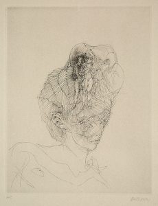 Chapeau-Filles, original etching signed. Paris, Gallery A. F. Petit, 1969. 29 x 22.5 cm; under mat. Original etching signed on the recto by Bellmer. Off edition on grey paper.