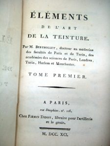 BERTHOLLET (Claude-Louis). — Éléments de l'art de la teinture. — Paris, F. Didot, 1791. — 2 vol. in-8, l, 336 p., vii, 404 p., [1] f., basane havane marbrée, dos lisse orné.