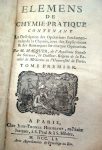MACQUER (Pierre-Joseph). — Elemens de chymie-pratique, contenant la description des opérations fondamentales de la chymie, avec des explications et des remarques sur chaque opération. — Paris, J.-T. Hérissant, 1751. — 2 vol. in-12, xii, [4]...