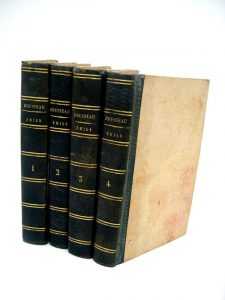 MARILLIER (Clément-Pierre, ill.) & ROUSSEAU (Jean-Jacques). — Émile ou l’éducation par J.J. Rousseau, citoyen de Genève. — 1791-1792. — 4 vol. in-8, 413 p., 333 p., 450 p. & 433 p., demi-cuir de Russie olive, dos lisse orné.