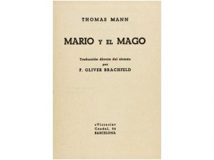 1945. (MAGIA). MANN, THOMAS: MARIO Y EL MAGO. Traducido por F. Oliver Brachfeld. B.: Victoria, 1945. 8°. 107 p., 2 h. Ilustraciones en negro dentro de texto. Enc. tela editorial. Primera edición.