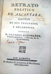 SANTIBAÑEZ (Leandro). — Retrato político de Alcantara, causas de sus progresso y decadencia. — Madrid, Blas Roman, 1779. — In-8, [9] f., 268 p., vélin ivoire souple, titre manuscrit au dos.